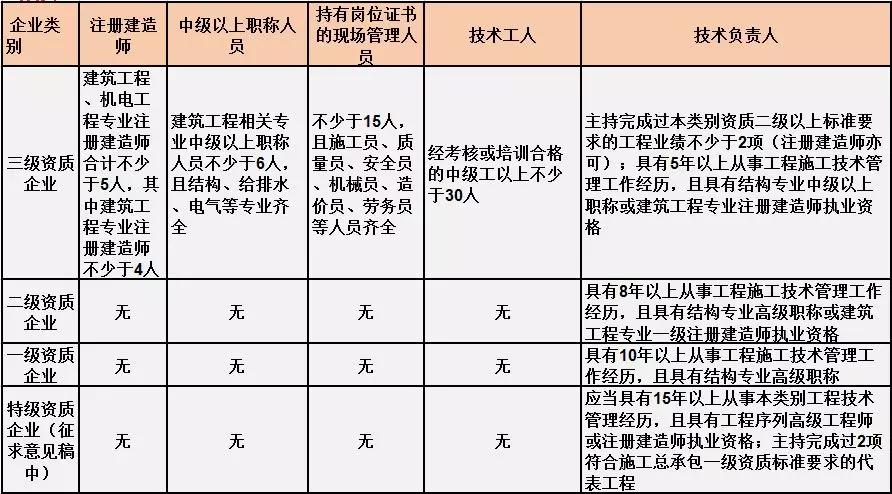 換句話說,并不是所有企業(yè)資質(zhì)都不要求有建造師等企業(yè)人員。施工總承包三級資質(zhì)企業(yè)對建造師等人員仍有要求,一級資質(zhì)、二級資質(zhì)企業(yè)保留技術(shù)負(fù)責(zé)人這一項要求,特級資質(zhì)另有規(guī)定。